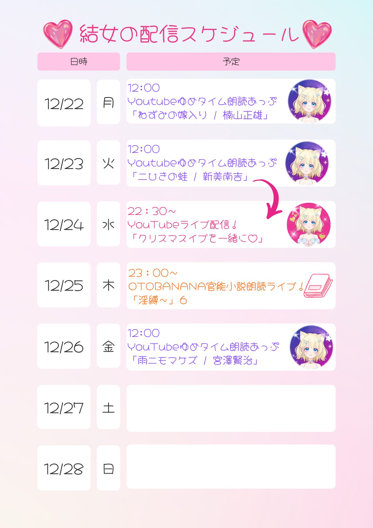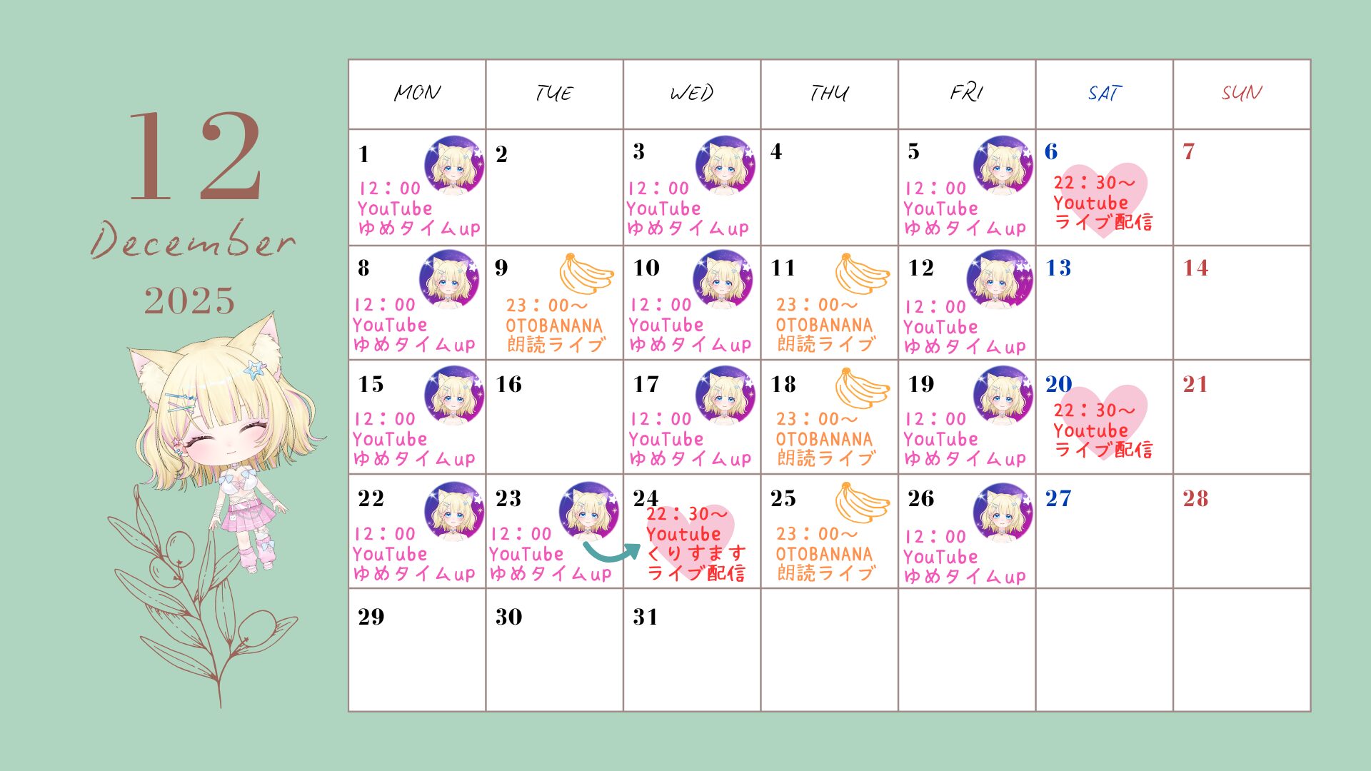 配信スケジュール スケジュール 11 2025-10-062025-12-21 目次 今週の配信スケジュール今月の配信スケジュール 今週の配信スケジュール 今月の配信スケジュール スケジュールは都度更新してまいります。 年末年始など、ゲリラ配信をする可能性大!